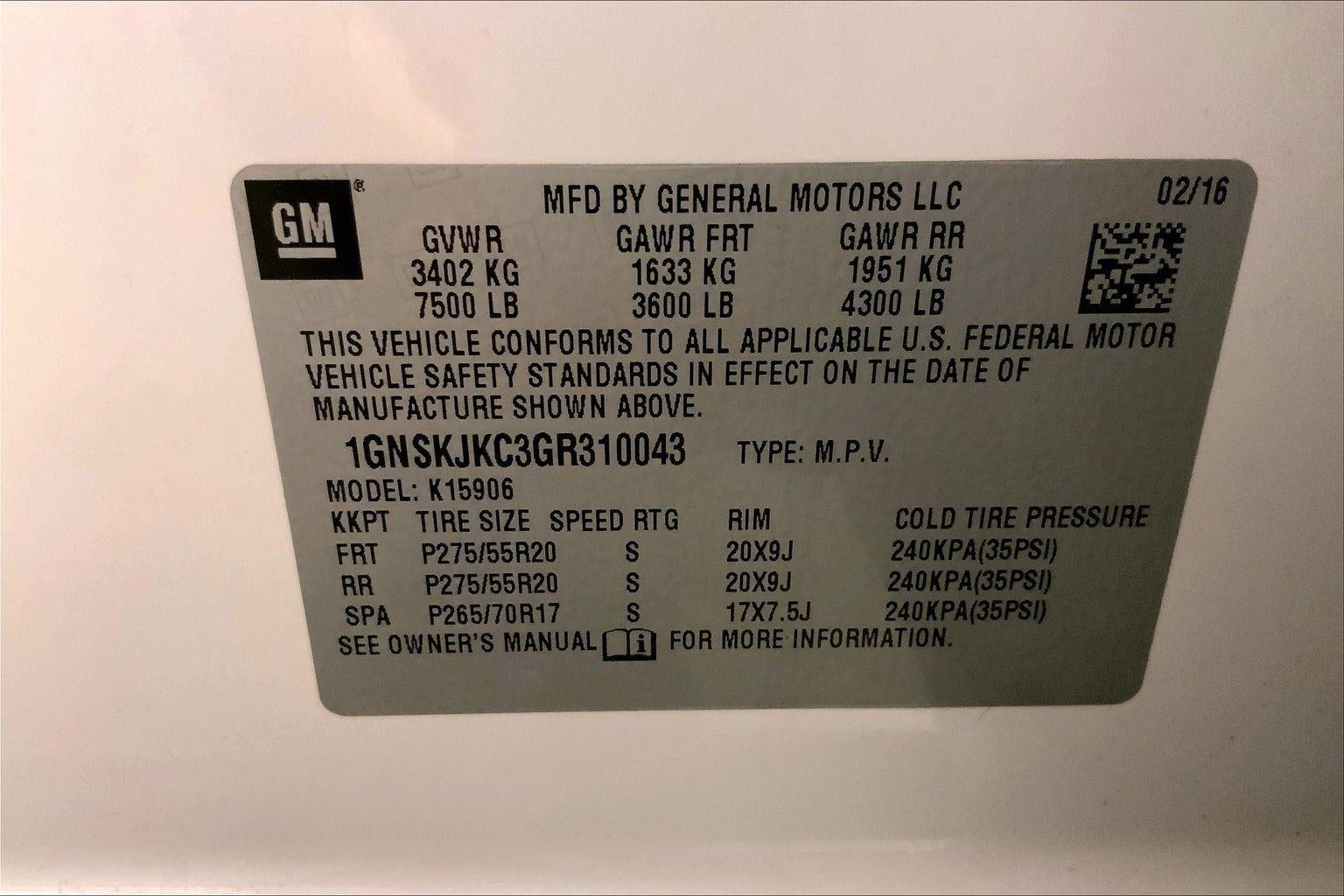 EMISSIONS, FEDERAL REQUIREMENTS, ENGINE, 5.3L V8 ECOTEC3 WITH ACTIVE FUEL MANAGEMENT, DIRECT INJECTION AND VARIABLE VALVE TIMING, TRANSMISSION, 6-SPEED AUTOMATIC, ELECTRONICALLY CONTROLLED, REAR AXLE, 3.08 RATIO, WHEELS, 20"" X 9"" (50.8 CM X 22.9 CM) CHROME, TIRES, P275/55R20 ALL-SEASON, BLACKWALL, PAINT SCHEME, SOLID APPLICATION, IRIDESCENT PEARL TRICOAT, SEATS, FRONT BUCKET WITH PERFORATED LEATHER-APPOINTED HEATED AND COOLED SEAT CUSHIONS, COCOA/DUNE, PERFORATED LEATHER-APPOINTED SEAT TRIM, AUDIO SYSTEM, CHEVROLET MYLINK RADIO WITH NAVIGATION AND 8"" DIAGONAL COLOR TOUCH-SCREEN, SUN, ENTERTAINMENT AND DESTINATIONS PACKAGE, SUNROOF, POWER, TILT-SLIDING, LICENSE PLATE FRONT MOUNTING PACKAGE, ENTERTAINMENT SYSTEM, REAR SEAT, BLU-RAY/DVD, DVD SCREEN, THIRD ROW, LPO, REAR CARGO MAT, ALL-WEATHER