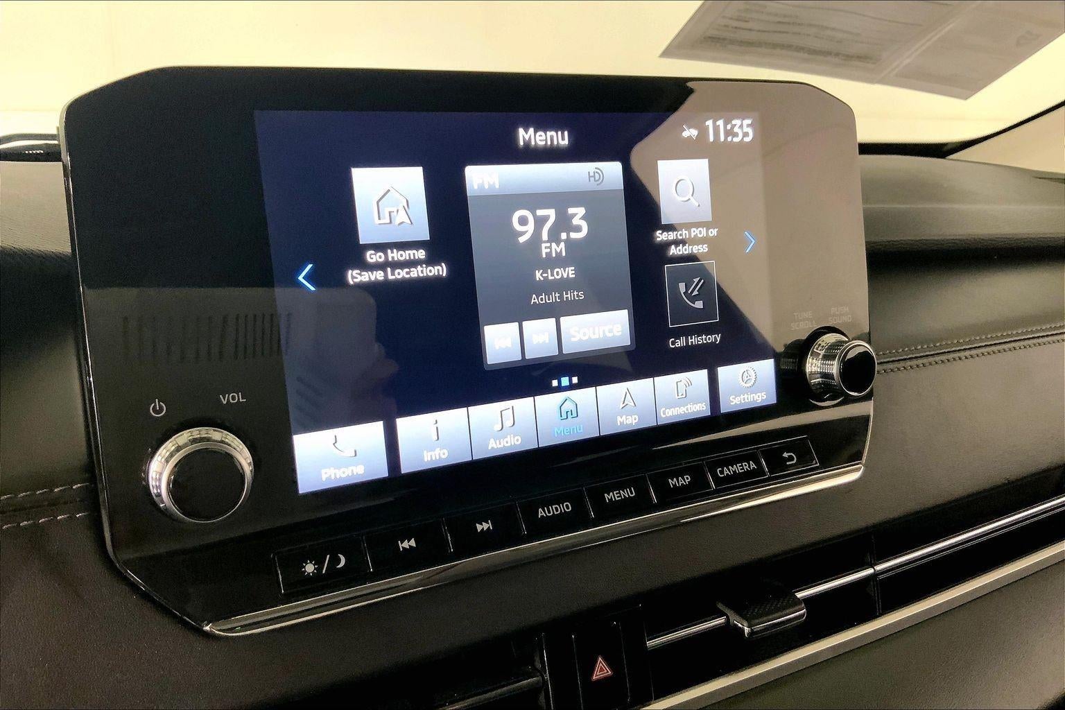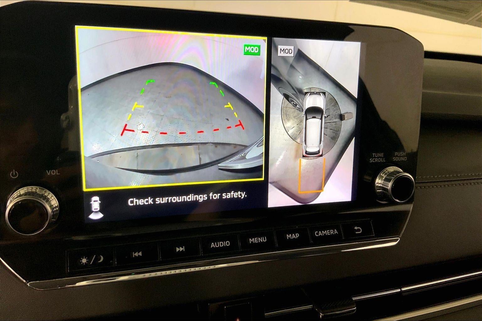 - The vehicle is equipped with a camera that displays an image of the area behind the vehicle on an interior display.
